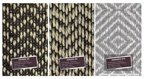 DIAMANTE H18 Peso/Weight: 2,50kg/m2 Espessura/Thickness: 9,00mm Cor: Negrito e Areia Color: Gray and Sand Esta foto não está em tamanho real para permitir uma melhor visibilidade da trama