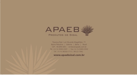 Travessa Rod. Luiz Eduardo Magalhães, 71 Bairro Petrolina | Valente | Bahia | Brasil CEP.: 48.890-000 | vendas@apaeb.com.br Tel. ( 55 75) 3263-2341 | Fax. ( 55 75) 3263-2342 Cel. ( 55 75) 98350-1713 | 98123-7942 www.apaebsisal.com.br